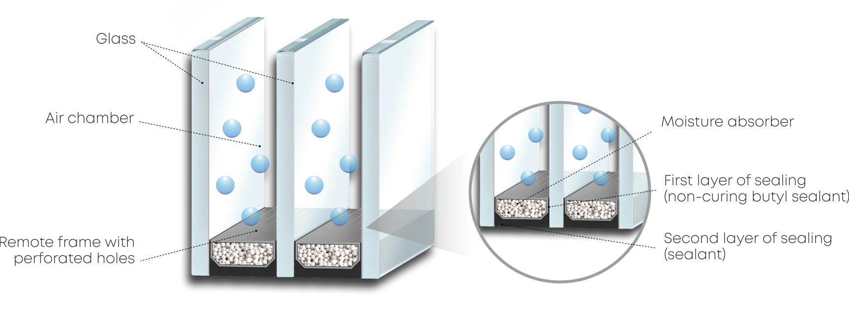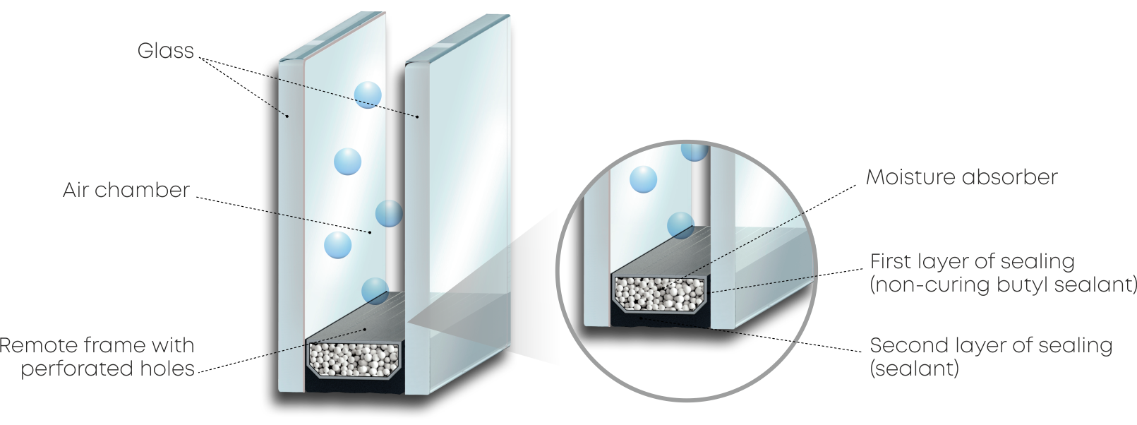 The absence of condensation between the glasses is achieved due to the action of a desiccant – a molecular sieve that absorbs all moisture in the chamber.