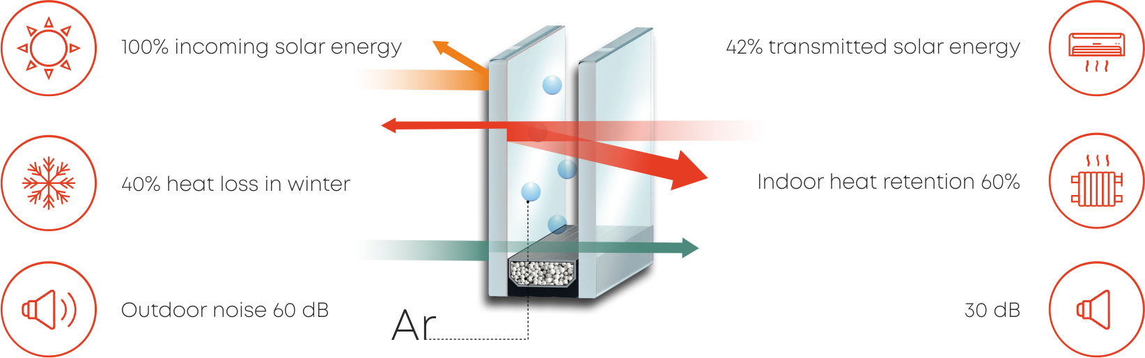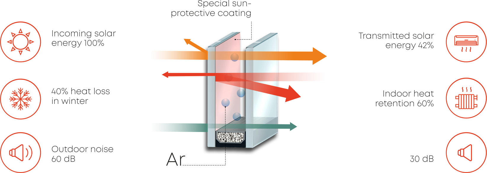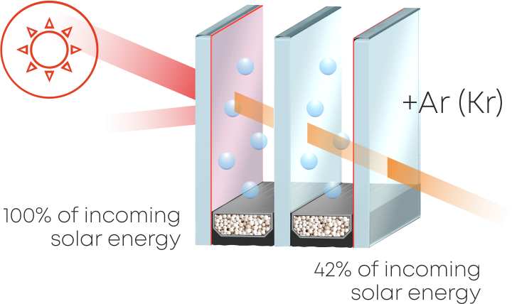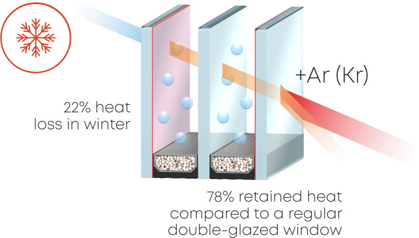 On average, filling with argon reduces heat loss by 15% relative to normal dried air And a double-glazed window filled with krypton improves thermal protection by 25 times compared to air-filled double-glazed windows.