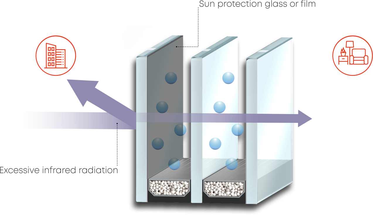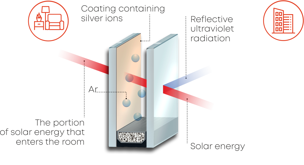 Multifunctional glass replaces one energy-saving glass pane in a double-glazed unit. The energy efficiency will be slightly lower, but in summer it perfectly protects the interior from solar heat.
