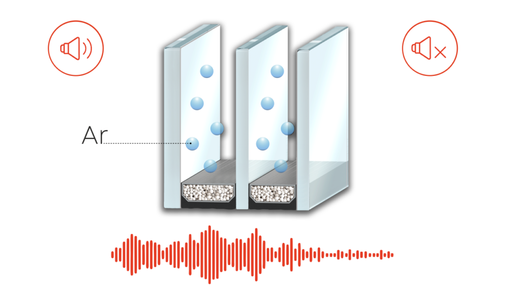 Filling the chambers with inert gas. Due to its higher viscosity (compared to air), argon (or krypton) transmits sound significantly worse, providing sound insulation.
