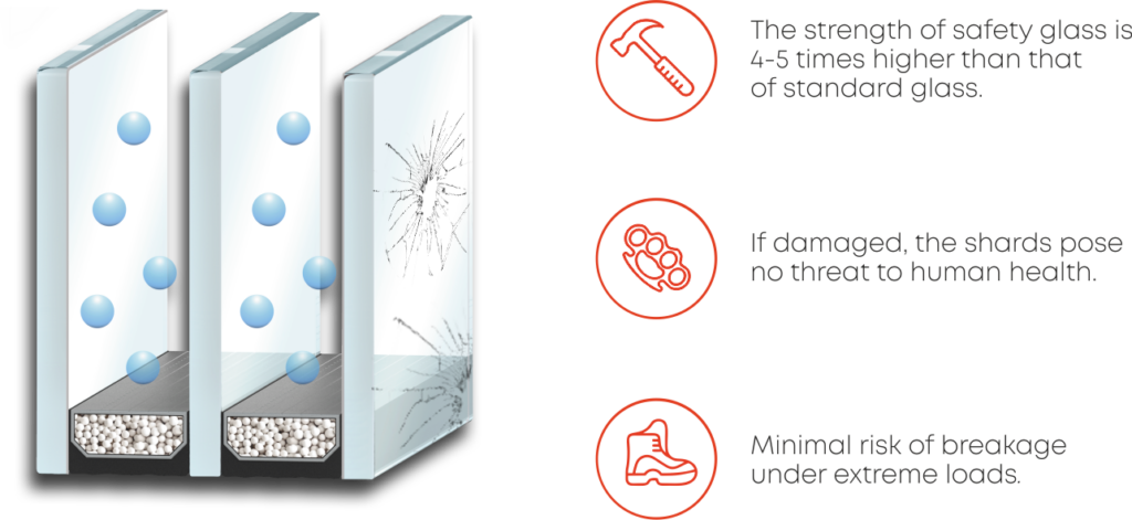 It strengthens the glazing and prevents the scattering of small glass fragments upon impact It features a special protective layer that guards against damage Safety glass is produced by laminating it with a special impact-resistant film, Safety GG-4 4 mil, which is 115 microns thick.