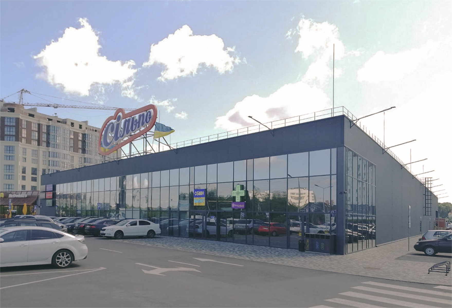 The exterior of the supermarket features a modern design - the mirrored facade combines lightness and practicality.