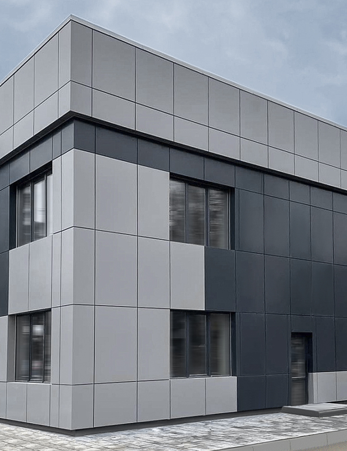 The building's facade is equipped with a ventilated facade system using aluminum composite panels as the cladding material.