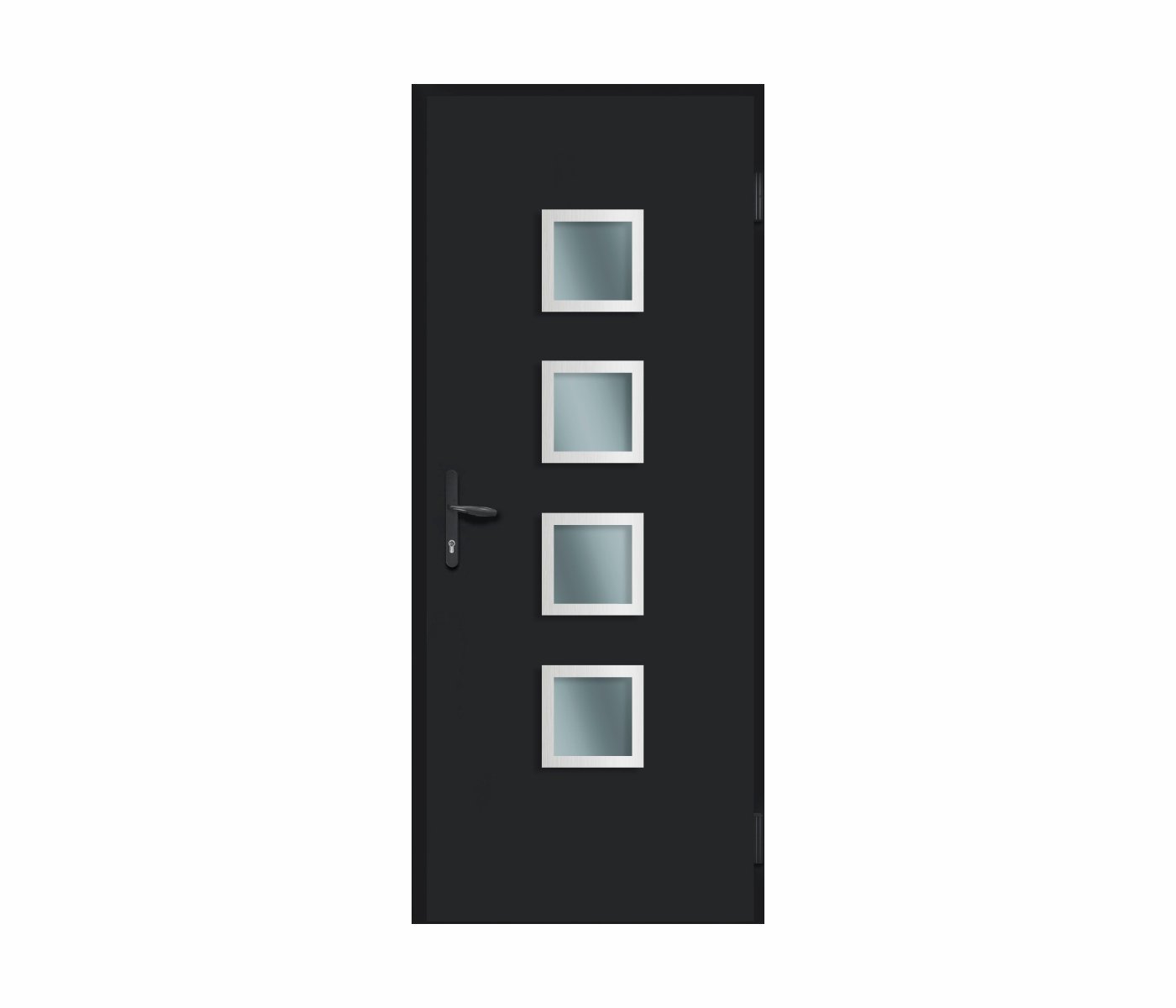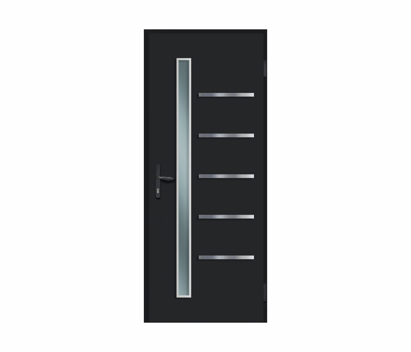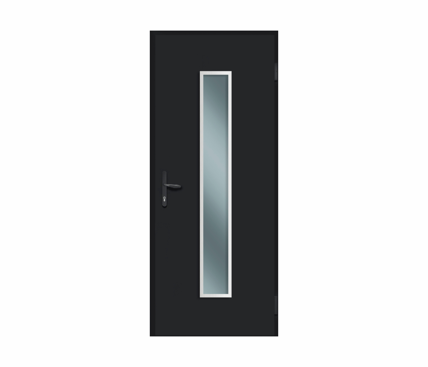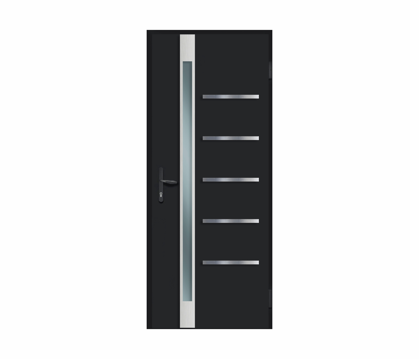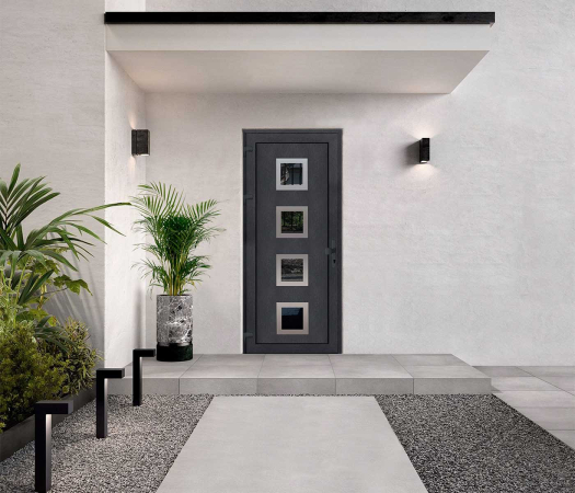 Entrance doors with improved sandwich panels, glued-in double-glazed windows and stainless steel moldings.